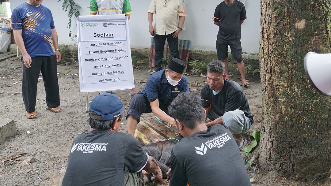 Penyembelihan dan pembagian hewan kurban dilakukan oleh tim panitia kurban dari Kemenkeu Maluku dan tim panitia dari yayasan Yakesma.